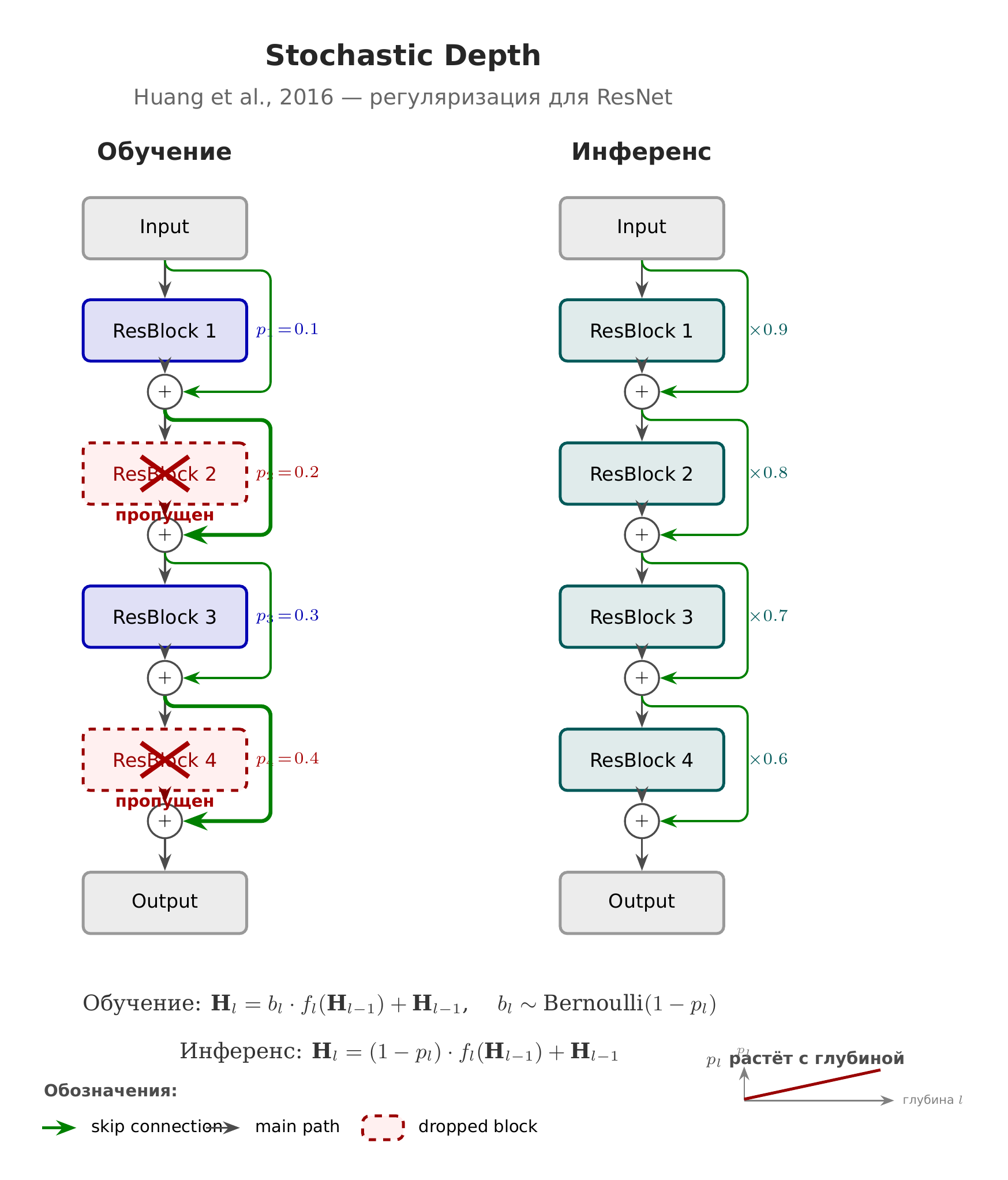 Stochastic Depth (стохастичная глубина): с вероятностью \(p\) выход блока обнуляется (ветка «пропускается»), residual остаётся. Вероятность \(p\) растёт с глубиной слоя. Регуляризация и ускорение обучения.